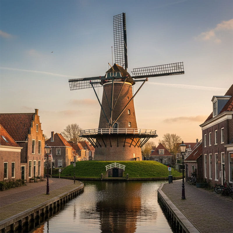Windmolens vormen het ultieme symbool van de Nederlandse strijd tegen het water en de vindingrijkheid van de vroege industrie. In het uitgestrekte, vlakke landschap waar de wind vrij spel heeft, werden deze ingenieuze machines eeuwenlang ingezet om polders droog te malen, graan tot meel te verwerken en boomstammen tot planken te zagen. De architectuur van de Nederlandse windmolen is door de tijd heen steeds verder verfijnd, waarbij de zware houten of stenen rompen werden ontworpen om de enorme krachten van de draaiende wieken op te vangen en om te zetten in mechanische energie.